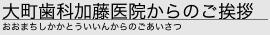 大町歯科のホームページにお越し頂きありがとうございます。当院は地域開業型医院として、一本の歯から、全体的に必要な治療まで、必要な治療を検討し、健康保険から自費治療まで、ニーズに合わせ多様に対応し、お口から健康を見直すお手伝いをさせて頂きたいと考えております。