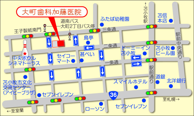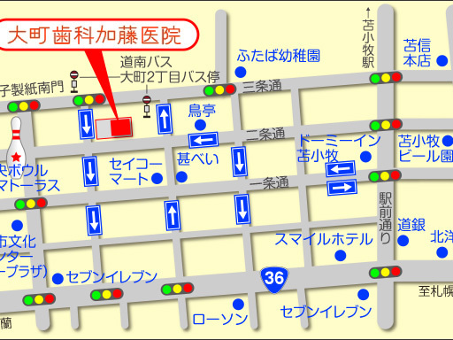 ・国道36号線を札幌方面からいらっしゃる方は、左手に市役所、警察署を通過、駅前通角にセブンイレブンがあり、少し行くとローソンが左手にありますので、次の交差点を右に曲がってください。進むと左手にセイコーマートがあり、次の交差点を左に曲がって80メートルです。